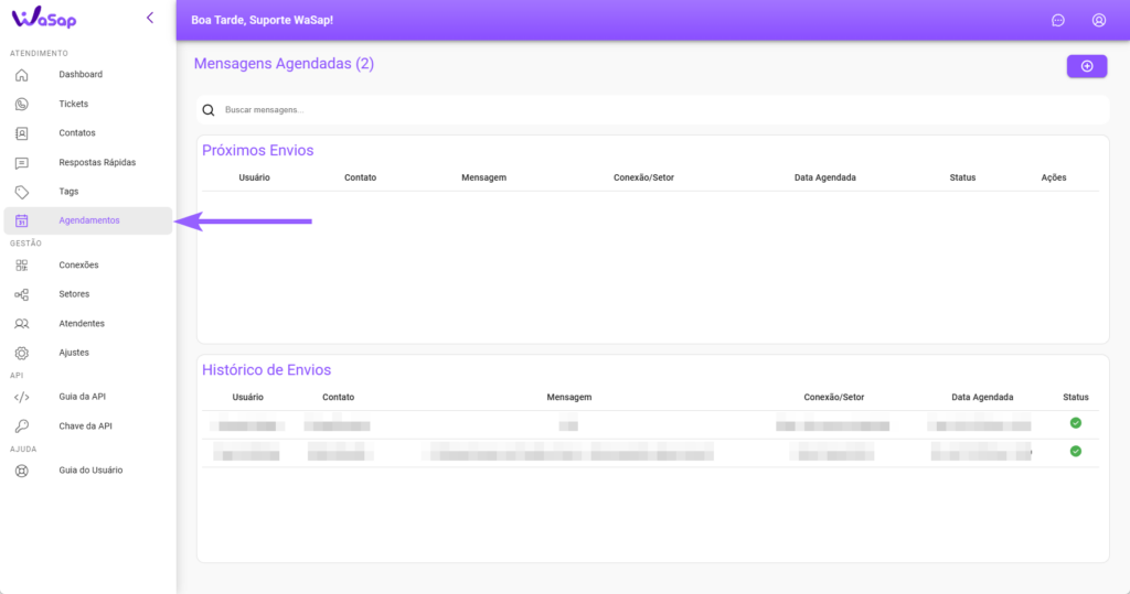 • Para visualizar os próximos envios e o histórico de mensagens agendadas, acesse o menu lateral e clique em “Agendamentos”. Lá, você terá todas as informações organizadas em um único lugar.
