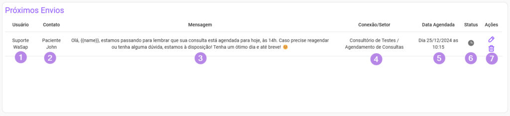 6. Status do envio, responsável por mostrar se a mensagens está agendada, enviada ou cancelada;