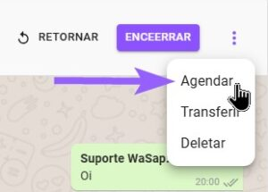 • Basta acessar o menu de opções no canto superior direito da conversa e selecionar a opção “Agendar”.