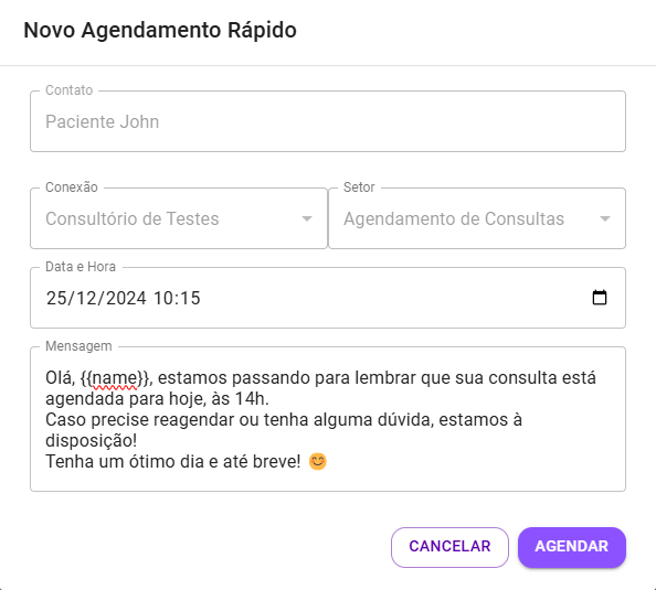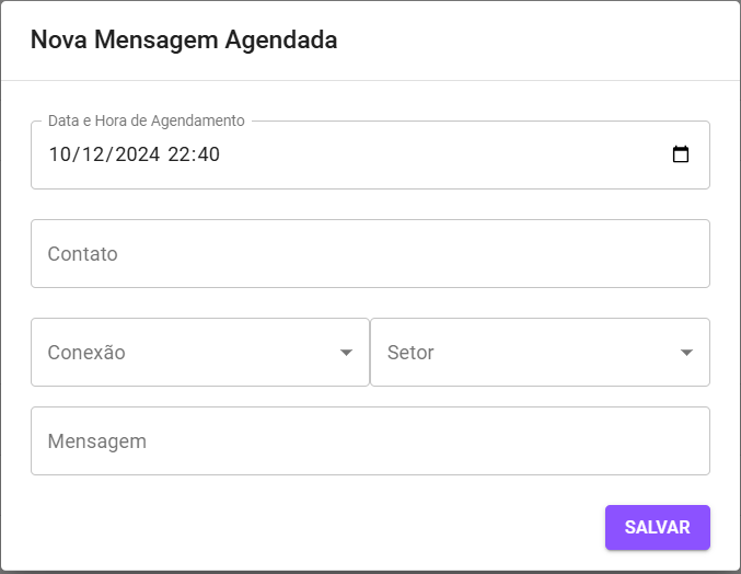 • O sistema irá assimilar automaticamente o nome do contato, setor e conexão que estão utilizando na conversa. É só você você preencher o campo ‘Data e Hora’ e o campo ‘Mensagem’, em seguida clicar em ‘Agendar’.