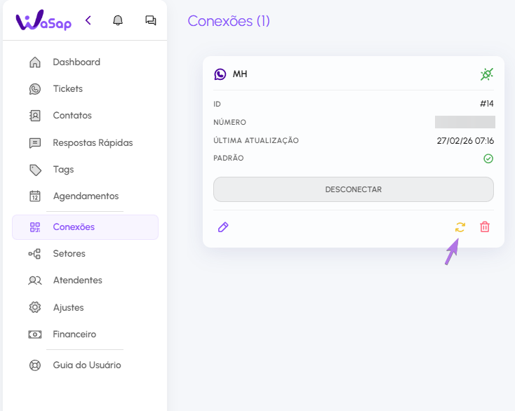 A função Reparar WaSap realiza uma reinicialização técnica da instância, restaurando serviços internos e revalidando comunicações com o WhatsApp.