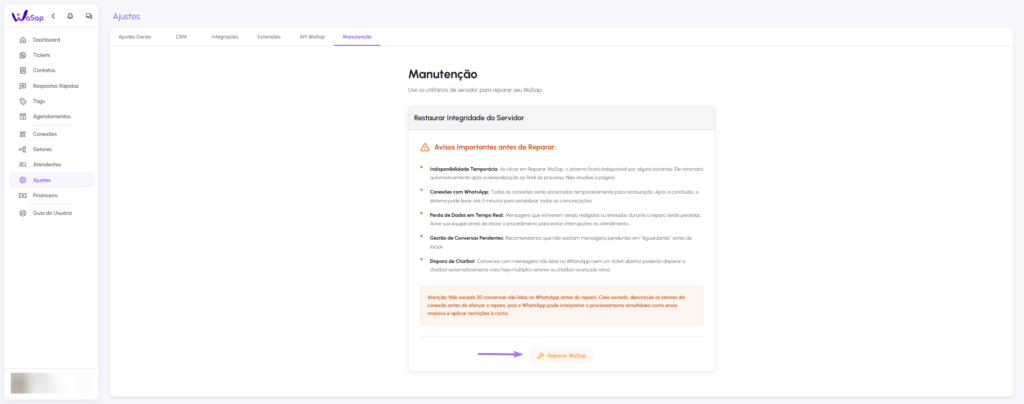 Ao clicar em Reparar WaSap, o sistema ficará indisponível por alguns instantes.